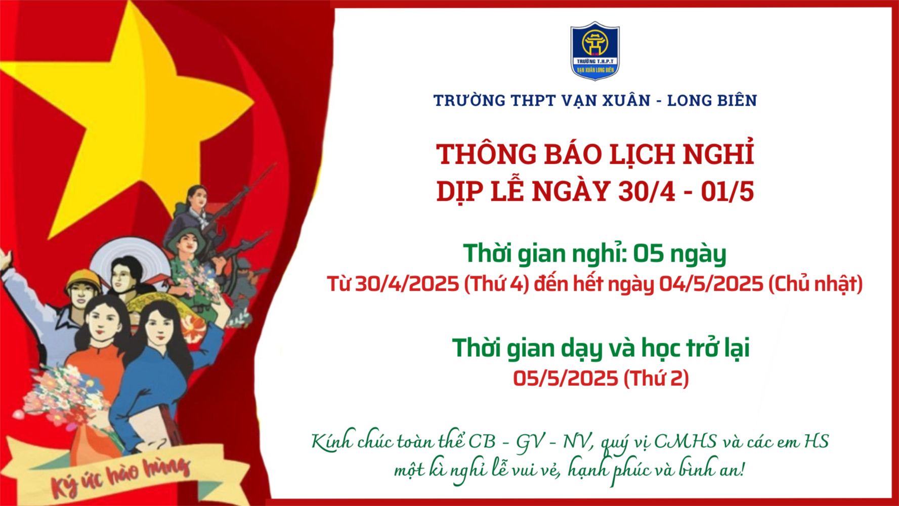 Trường THPT Vạn Xuân Long Biên kính gửi toàn thể CB-GV- NV, quý CMHS, các em HS Lịch nghỉ dịp lễ ngày 30/4 và 1/5. Cụ thể: