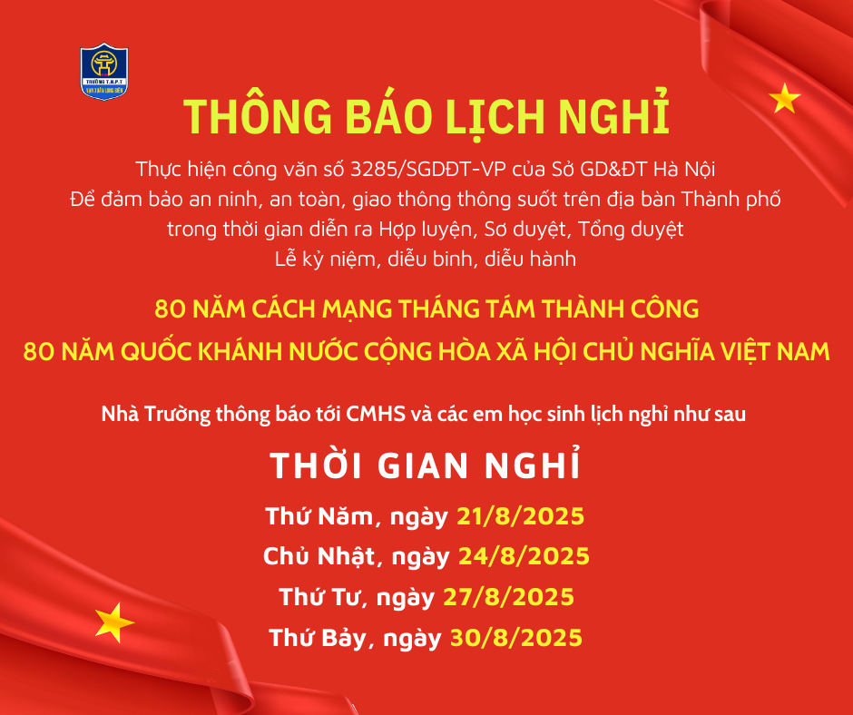 Nhà trường tin tưởng rằng những ngày nghỉ đặc biệt này sẽ là khoảnh khắc ý nghĩa để Quý CMHS và các con học sinh cùng hòa nhịp với khí thế hào hùng của dân tộc, cảm nhận sâu sắc niềm tự hào Việt Nam.